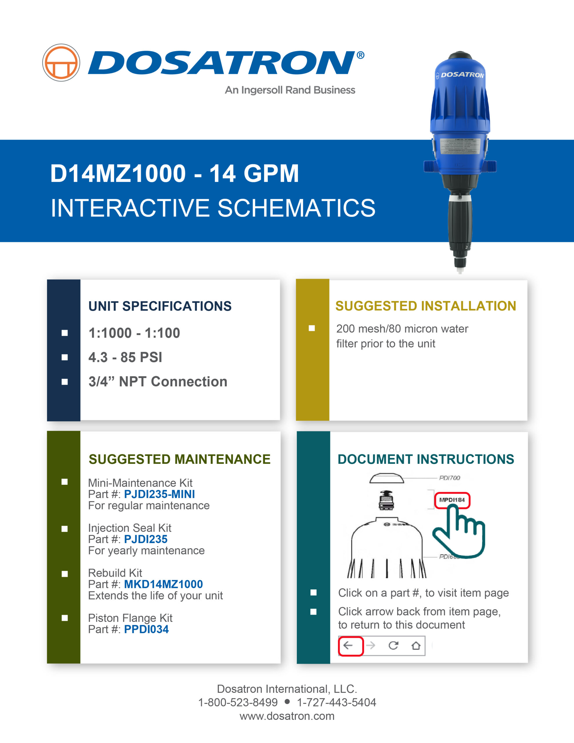 Water-powered Dosatron D14MZ1000-HY with dosing scale specifically designed for hydroponic applications. Includes an integrated by-pass to easily switch the nutrients on and off. Unit made to be installed in series as part of a hydroponic system with included union fitting. It has a flow range of 0.05 to 14 GPM and a dilution range of 1:1000 – 1:100 (0.1% to 1%).