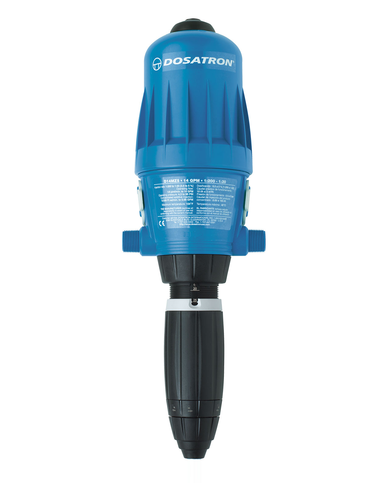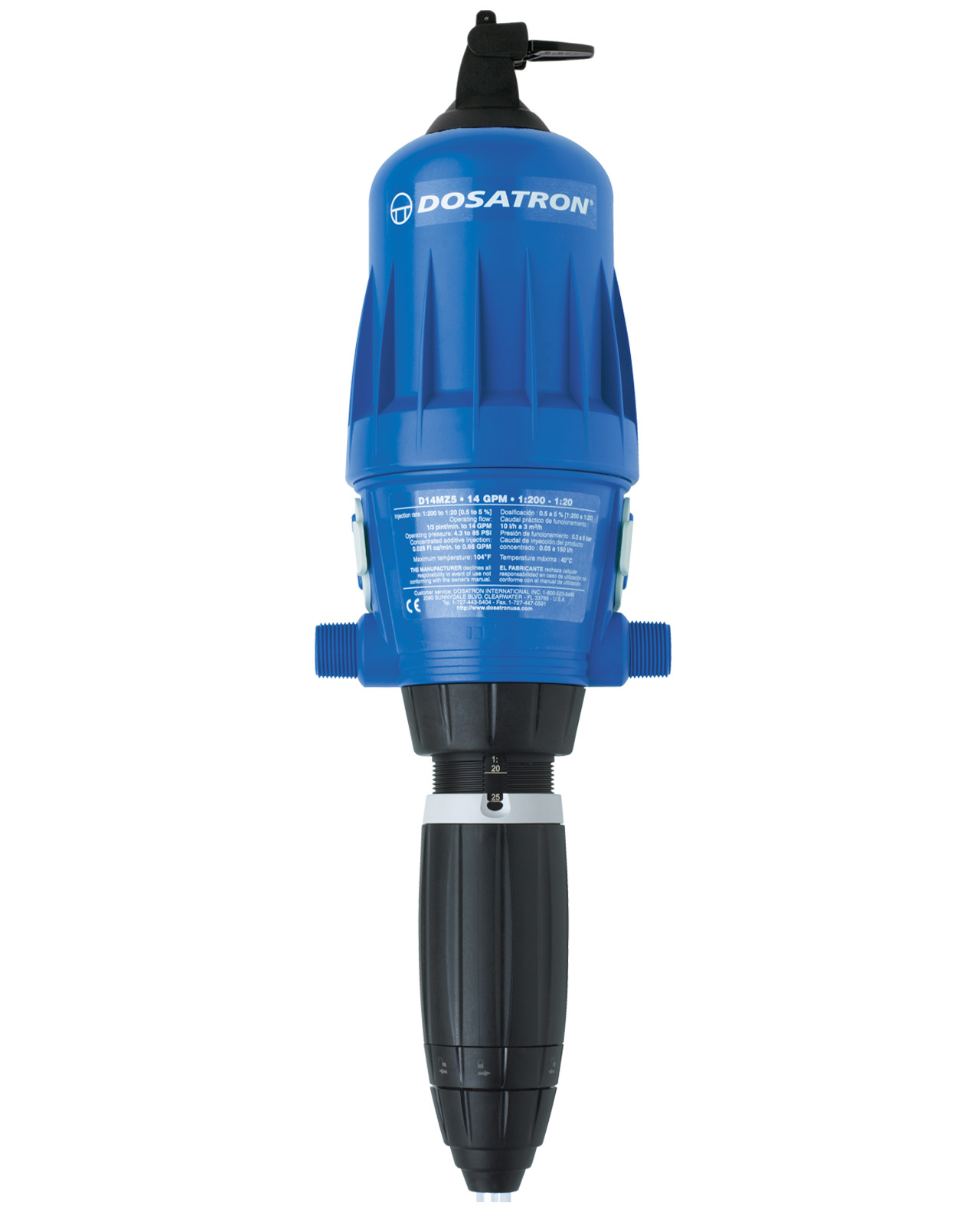 Water-Powered Dosatron D14MZ5 – 14 GPM is used in irrigation and industrial applications. It has a flow range of 0.05 to 14 GPM and a dilution range of1:200 to 1:20 (0.5% to 5%). For industrial applications installation is easy with an Industrial Plumbing Kit # IPK34-14GPM.