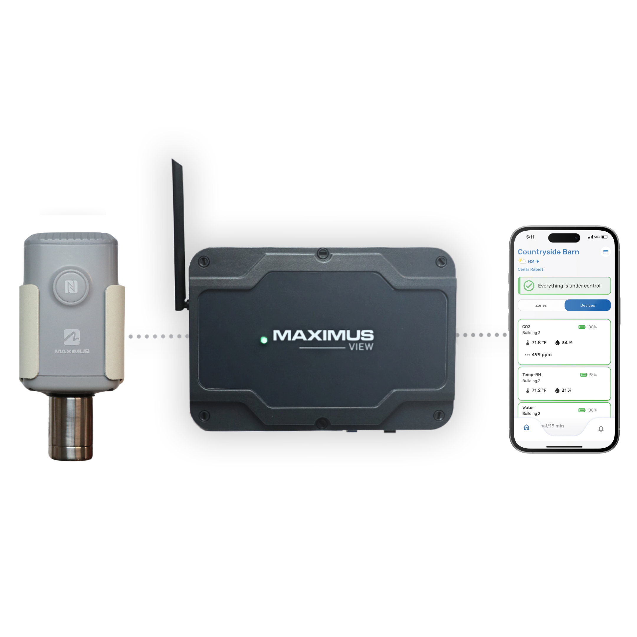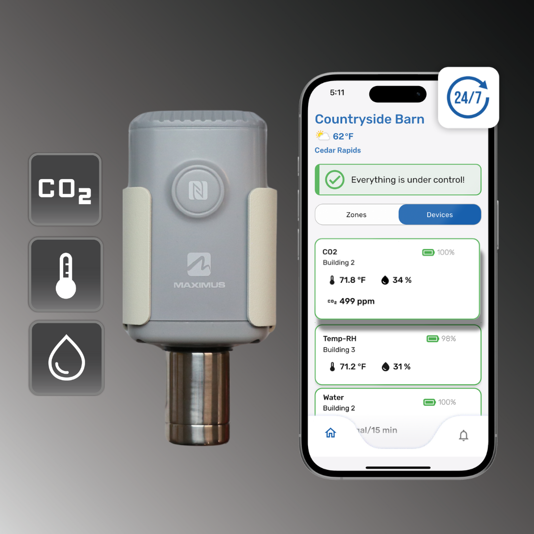 Designed for the demanding conditions of greenhouses and livestock farms, this rugged, battery-powered sensor*, when connected to the MAXIMUS View system, delivers real-time monitoring of carbon dioxide (CO₂), temperature, and humidity — all in one compact device.